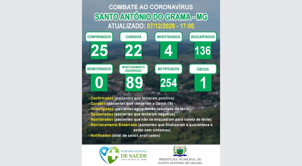 O Comitê de Operações de Emergência de enfrentamento a proliferação do Covid-19, confirma hoje (07/12/2020), mais dois casos de Covid-19 em Santo Antônio do Grama. Trata-se de um homem de (27 anos) assintomático e uma mulher de (32 anos) sintomática. A Vigilância Epidemiológica juntamente com a Equipe de Atenção Básica, informam que os casos e contatos próximos estão em quarentena, sendo monitorados pelas Unidades de Saúde em domicílio. Com as novas confirmações Santo Antônio do Grama chega a vinte e cinco casos confirmados.